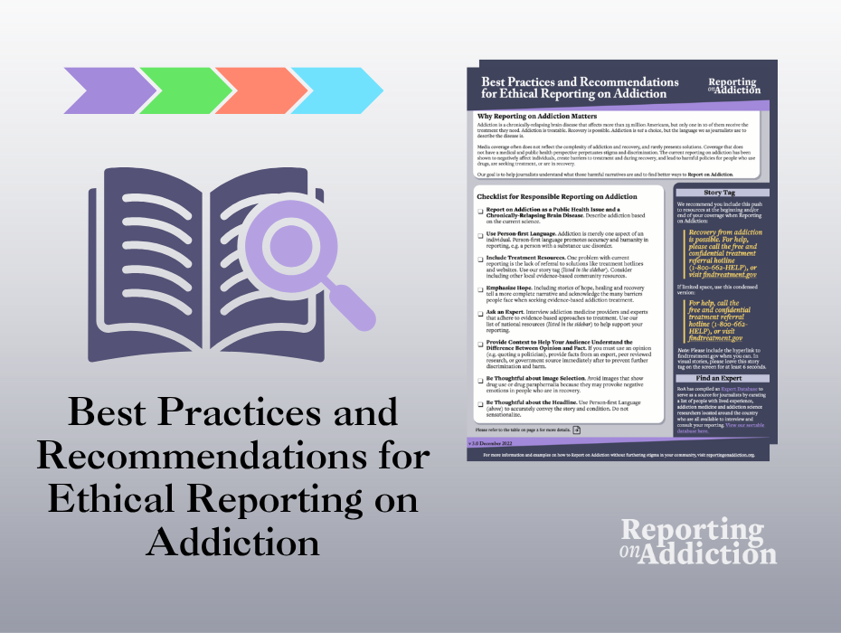 We frequently publish ready-to-use and easy-to-implement resources that feature best practices and recommendations for your reporting, including style guides for producing ethical addiction reporting and imagery and a digital security guide for protecting yourself and sources online.